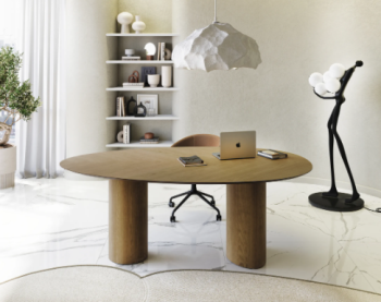 Tampo em MDF com chanfro que apresenta efeito de “borda infinita”. Bases em compensado flexível. Produto fornecido desmontado, sendo necessário apenas parafusar bases ao tampo.